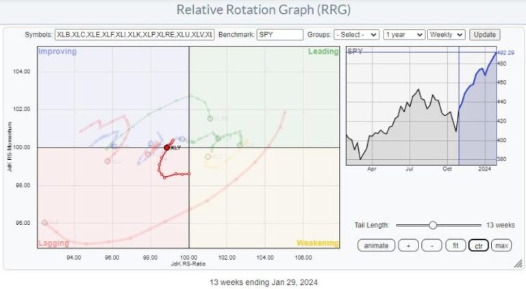 This shows the tail for XLY:RSPD is rapidly moving into the lagging quadrant, confirming that rotation favors non-large/mega-cap stocks in the consumer discretionary sector.
