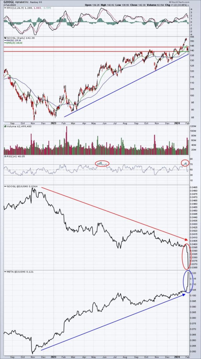 Nearly two weeks ago, I was discussing in our FREE EB Digest newsletter why I felt Alphabet (GOOGL) was poised for a decline after earnings. It was continuing to push higher, which, on the surface, was a fairly bullish signal. However, if you looked at how strong internet stocks ($DJUSNS) were performing as a whole, then it became rather obvious that the big Wall Street firms weren’t overly impressed with GOOGL as it head towards its quarterly earnings release. Check out the bottom two panels – the first showing GOOGL:$DJUSNS relative strength and then the second showing the relative strength of Meta Platforms (META) vs. the internet group (META:$DJUSNS):