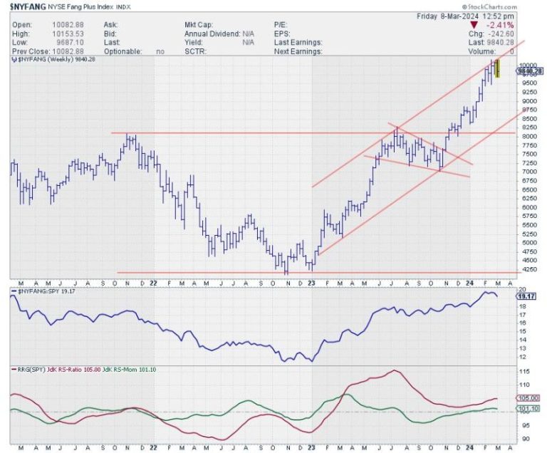 It is no secret that the NYFANG+ Index is still in in incredible up-run after bottoming out in October last year and subsequently breaking significant overhead resistance around 8.000. In the last 3-5 weeks, the index stalled just below 10.000 and moved sideways.
