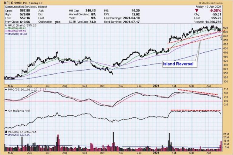 Also, the On-Balance Volume (OBV) went flat to slightly falling. OBV usually tracks price, and when it doesn’t, it should attract our attention. In this case, it is suggesting that NFLX is not attracting sufficient volume to justify the rise in price.