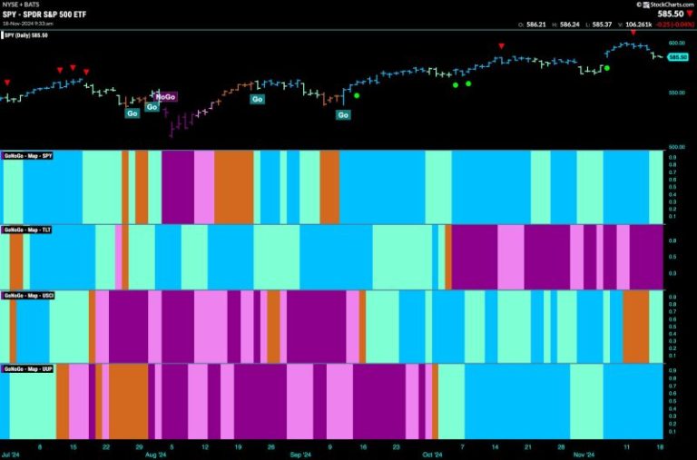 Good morning and welcome to this week’s Flight Path. Equities saw the “Go” trend continue this week but we saw weaker aqua bars at the end of the week. Treasury bond prices painted strong purple “NoGo” bars as the weight of the evidence suggested the “NoGo” will continue. U.S. commodities painted aqua “Go” bars after flirting with amber “Go Fish” bars of uncertainty last week. The dollar showed no weakness this week with an uninterrupted string of bright blue “Go” bars.