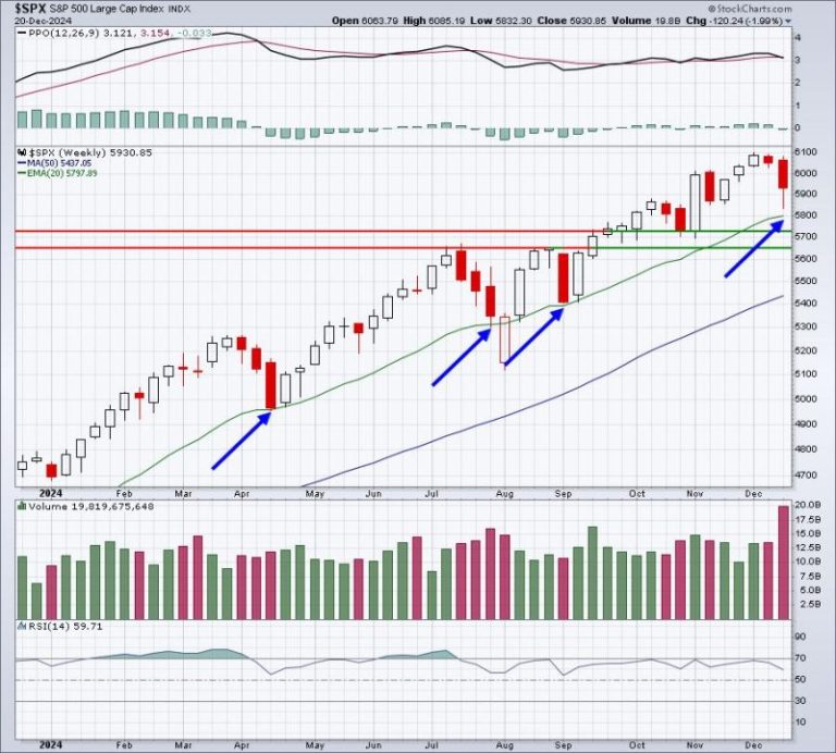 Now, if you weren’t aware of any news, would you think any differently about this pullback to the 20-week EMA than prior tests to the same level? There was a volume spike, but keep in mind it was December monthly options expiration week. Quad-witching months (March, June, September, and December) typically are accompanied by heavier volume. The Friday market recovery occurred before any significant breakdown on this chart, which I find bullish. I view the stock market action from December 21st through December 31st to be the period where we normally see a “Santa Claus rally” – more on that below.