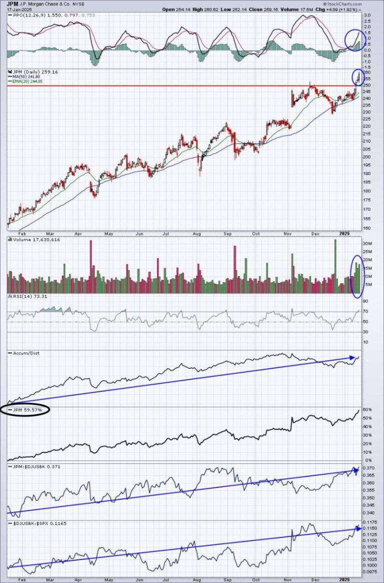 JP Morgan Chase (JPM) posted great results, but it was very easy to assume great earnings were coming. Why? Well, look at the chart and check out the relative strength line, which hit a 52-week high in December, the last month of Q4: