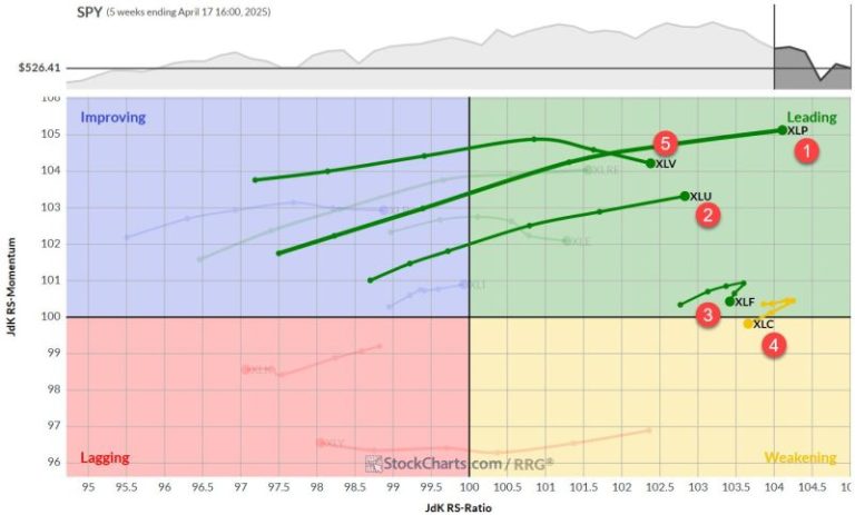 XLC has been the biggest loser among the top sectors, breaking support around 95 and declining rapidly to support near 82.50. We’re currently seeing a bounce off that support. Relative strength is maintaining its rising channel, keeping the RS ratio well above 100. However, the momentum line has dipped below 100, temporarily pushing XLC into the weakening quadrant. The uptrend in relative strength is still in play, though — something to watch closely.